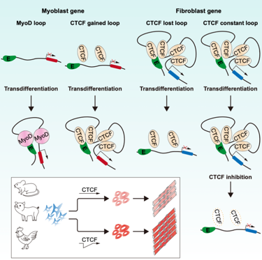 本研究利用Hi-ChIP技术,捕获并分析了成纤维细胞转分化为肌肉细胞过程中,先驱转录因子MyoD和结构因子CTCF介导的染色质互作的变化特征。发现MyoD主要介导了增强子相关的互作,可以拉近增强子元件与肌肉功能基因启动子之间的距离进而促进肌肉基因的表达。而结构蛋白的CTCF介导的染色质构象是动态变化的,新增的CTCF互作有利于肌肉基因的上调,而丢失的CTCF互作则导致成纤维基因的下调。但是,转分化后的细胞中仍然残留着大量成纤维细胞内保守的CTCF互作,这些顽固不变的互作则阻碍了细胞转分化的进程。该团队进一步人为干预并消除这些障碍,使得成纤维细胞的身份削弱,提高了猪、鸡和小鼠的成纤维细胞转分化效率。本研究为细胞命运转变的表观调控机制提供了新理论,也为提高肌肉生成效率提供新的思路与策略。