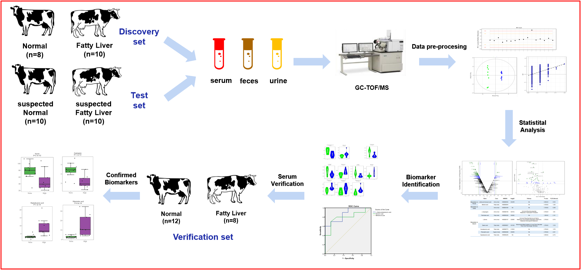 奶牛养殖的围产期常发生以脂肪肝为代表的代谢紊乱性疾病,诊断准确性低、不易及早发现的问题导致牛奶减产、围产期奶牛高淘汰率的现状,严重制约着奶牛养殖业的健康可持续发展。针对这一重要的畜牧产业问题,该研究经过多年的产业追踪与调研,收集围产期发生(重度)脂肪肝奶牛的代谢物(血、尿和粪便),经代谢物的组学分析,发现脂肪肝奶牛的机体代谢伴随着能量利用障碍、氧化应激和炎症,并在血清、尿液和粪便中发现显著变化的代谢物。其中,病牛血清中的丝氨酸、天门冬酰胺以及棕榈油酸、硬脂酸等、粪便中的代谢物氨基丁酸和山嵛酸、尿液中的代谢物酪氨酸都发生显著变化;经过第三群体验证发现这些标记的重现性非常高。因而,这些代谢物成分可以作为诊断围产期奶牛发生脂肪肝及相关代谢疾病的标记物,尤其是粪、尿代谢物标记物(氨基丁酸、山嵛酸和酪氨酸)可作为无创诊断的新型代谢物。这些具备无创检测优势的新型标记物已经获得国际和国家发明专利授权,未来在围产期奶牛代谢紊乱的预警、早期预防中具备重要的应用价值。对于解决全世界奶牛养殖业中围产期奶牛淘汰率高的问题,促进全世界奶业生产的健康可持续发展具有重要的研究价值与应用价值。