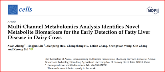 山东农业大学动物科技学院师科荣副教授团队,在奶牛围产期代谢紊乱症的预警与无创诊断的新型标记研究方面取得重要进展。2022年9月16日,其最新研究成果发表在国际知名学术期刊《Cells》的“肝损伤与再生:从基础到临床”板块,题为“Multi-Channel Metabolomics Analysis Identifies Novel Metabolite Biomarkers for the Early Detection of Fatty Liver Disease in Dairy Cows”。