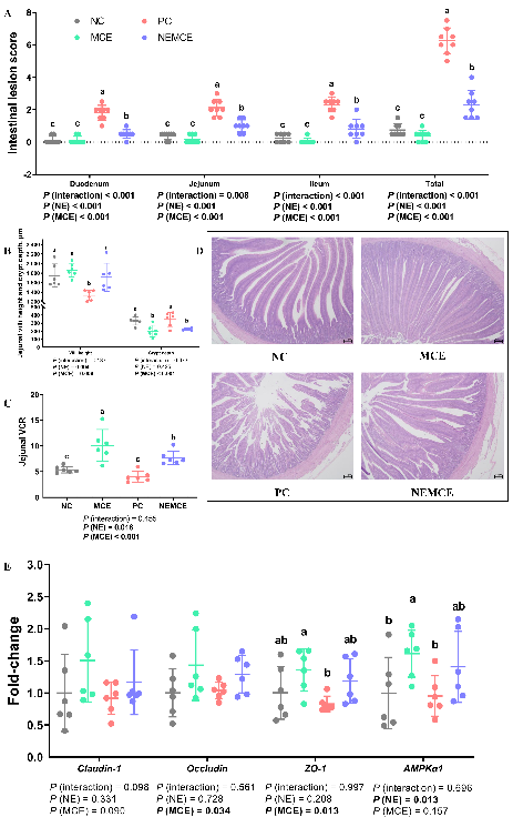 本研究发现,感染NE的肉鸡的生长性能显著下降。产气荚膜梭状芽孢杆菌在肠道中的快速增殖破坏了肠道的形态结构和完整性,导致了显著的肠道炎症和系统性炎症。同时,盲肠中与炎症、肥胖和抑郁相关的细菌AlistipesBarnesiellaIntestinimonasRF39UCG-005丰度增加,产生短链脂肪酸的细菌AnaerotruncusButyricicoccusBacteroides相对丰度降低。350mg/kg MCE显著提高NE肉鸡的生长性能,减少肠道损伤,减轻肠道炎症。盲肠中产气荚膜梭状芽孢杆菌的数量显著减少,与炎症、肥胖和抑郁相关的细菌AlistipesBarnesiellaUCG-010丰度减少,产生短链脂肪酸的细菌StreptococcusRuminococcus_torques_groupLachnospiraceae_NK4A136_group相对丰度增加。