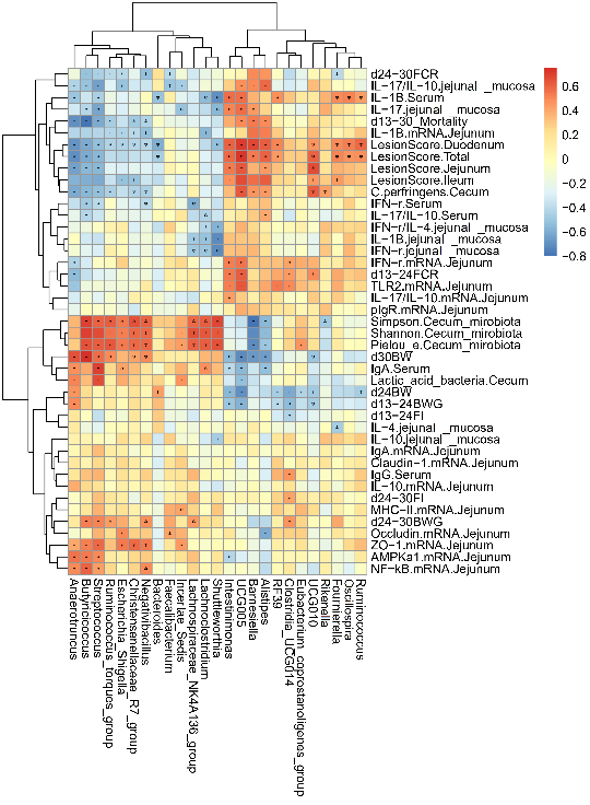 有趣的是,NE肉鸡盲肠中BarnesiellaAlistipes的相对丰度较高,而LachnoclostridiumShuttleworthia的相对丰度较低。在日粮中添加MCE后,该情况发生了逆转。Sperman相关分析表明,BarnesiellaAlistipes与肠道炎症加剧和生长性能受抑制有关,而LachnoclostridiumShuttleworthia与抗炎作用有关。LachnoclostridiumShuttleworthia可能在MCE减轻肉鸡NE中发挥重要作用。该结果为理解MCENE肉鸡的免疫功能和肠道菌群的调节作用提供了新的见解。