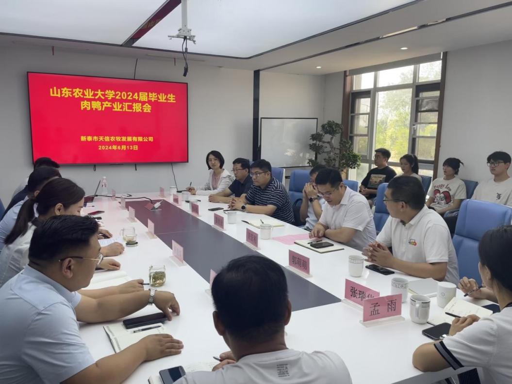 6月13日,一场别开生面的肉鸭产业交流会在新泰市楼德镇乡村振兴示范区——天信农牧循环产业园举办。来自山东农业大学动物医学院、动物科技学院和食品科学与工程学院的12名2024届本科、硕士和博士毕业生,以毕业论文汇报的形式,拉开了交流会的序幕。