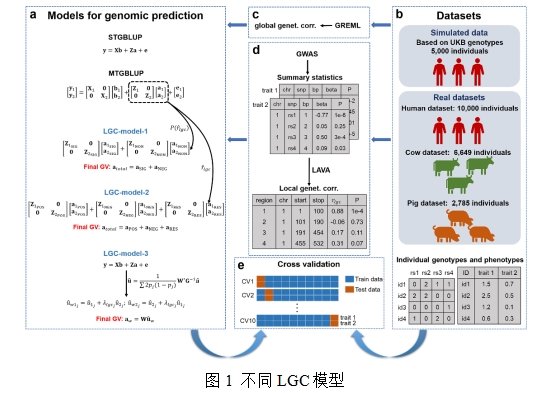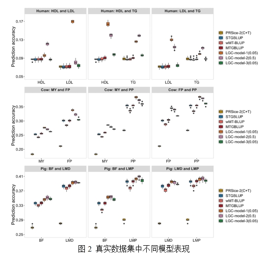 该团队通过估计多对性状间的局部遗传相关发现,遗传相关在整个基因组中具有异质性。基于此信息,该团队提出了三种整合局部遗传相关信息的多性状基因组预测方法(LGC-model-1、LGC-model-2和LGC-model-3),并使用模拟数据和三个真实数据集(人类、牛和猪)评估了新方法的性能(图1)。与传统的多性状基因组预测模型(MTGBLUP)相比,三种LGC模型可使预测准确性平均提高12.76%(图2)。该研究成果以“Improving multi-trait genomic prediction by incorporating local genetic correlations”为题,于近日在线发表于《Communications Biology》。团队博士后滕军为该论文的第一作者,张勤教授和王丹教授为通讯作者。
