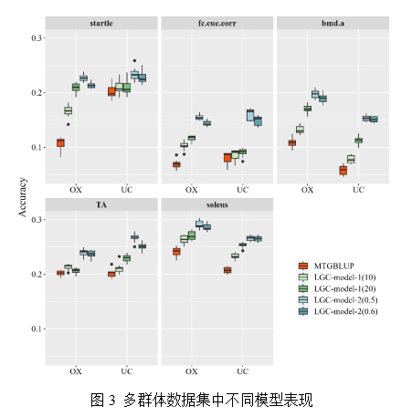 另外,该团队还将他们提出的方法(LGC-model-1和LGC-model-2)扩展到多群体基因组预测中(将同一性状在不同群体中的表现视为不同性状)。通过对小鼠和奶牛多群体真实数据集的分析发现,LGC模型也能提高预测准确性。与MTGBLUP模型相比,LGC模型的预测准确性提高幅度可达到163.86%(平均25.64%)(图3)。该研究成果以“Improving multi-population genomic prediction accuracy using multi-trait GBLUP models which incorporate global or local genetic correlation information”为题发表于《Briefings in Bioinformatics》。团队博士后滕军为该论文的第一作者,张勤教授和宁超副教授为通讯作者。