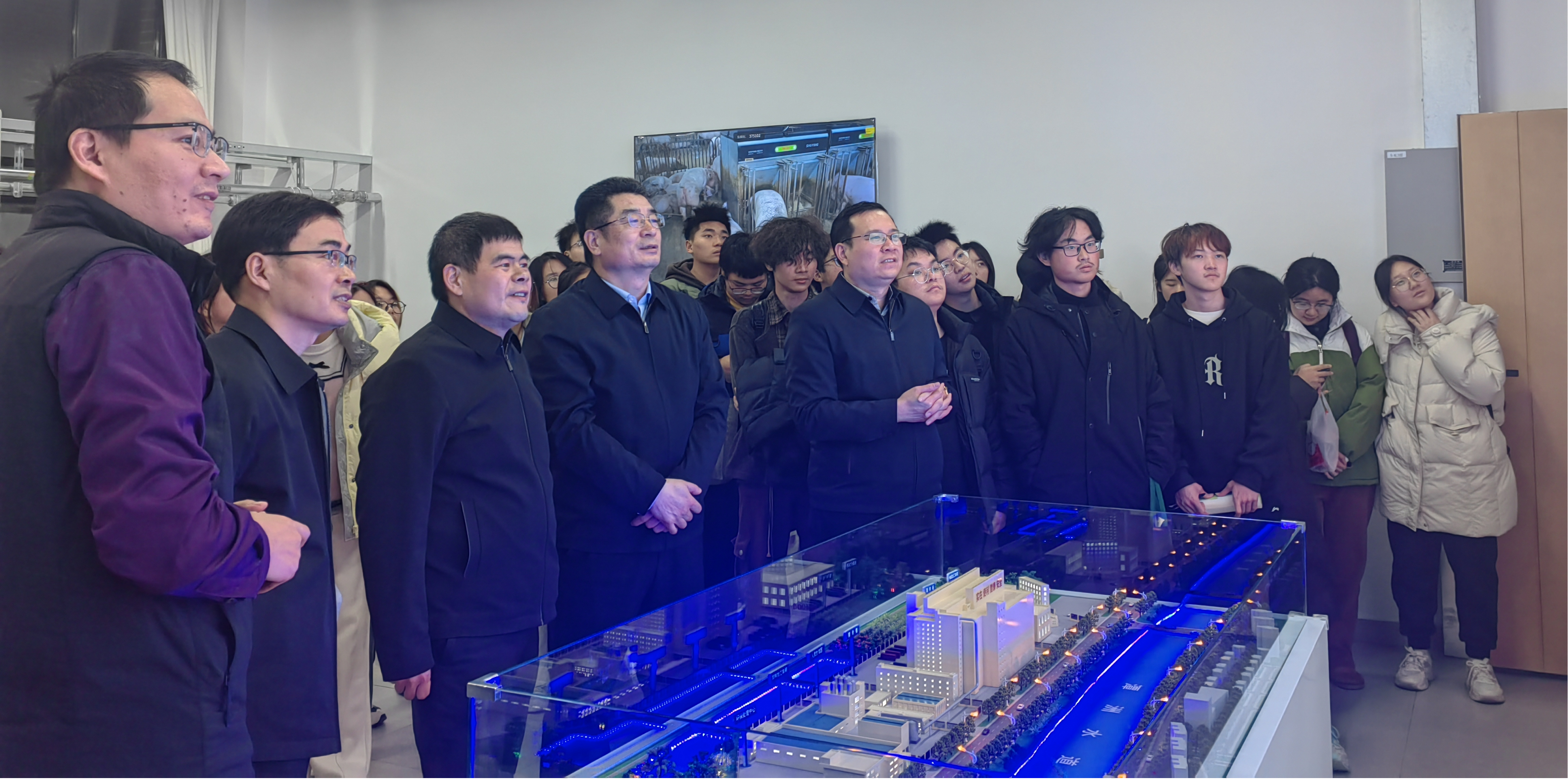 课后,高立明又带领同学们到学院新建成的“智慧牧业虚拟仿真实验室”进行参观,开展思政课现场教学,并与学院领导班子就发挥各类实习实训平台作用,做好学生思政和专业教育进行交流和指导。