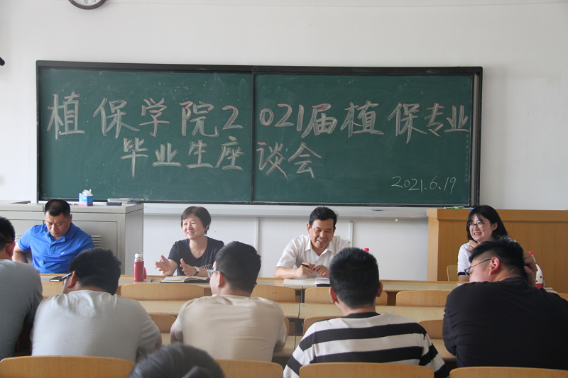 6月19日上午,植物保护学院于南校区教学楼举行2021届毕业生专业座谈会。学院党委书记刘孟臣,院长许永玉,党委副书记刘志勇,学院副院长原雪峰、薛超彬和各位专业老师参会,与2021届毕业生进行亲切的交流。