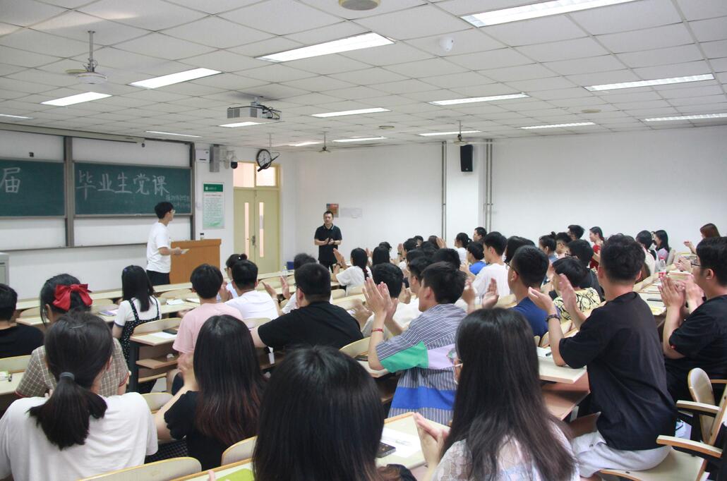 课上,刘志勇副书记以中美关系、俄乌局势、粮食安全、就业形势等为例,分析了国内外局势及国家发展状况,要求党员一定要认清形势,把握好人生方向。同2022届毕业生们一同回顾党的奋斗历史,深刻阐述学习党史的重大意义。他认为,全体党员在任何时候、任何情况下都要以习近平新时代中国特色社会主义思想为指导,勇于接受各种困难挑战,坚决执行党的决定。刘志勇指出,在实现中华民族伟大复兴的关键时刻,青年党员要保持先进性、加强道德修养、坚定理想信念。要求青年党员始终把以人民为中心的理念贯彻到今后的工作中,时刻以优秀党员的要求约束自己,发挥党的先锋作用。期望之余,不乏深情寄语,他说“温室里养不出万年松,庭院里跑不出千里马”,殷切期望同学们在实干中经风雨、长才干,激励大家在青春的赛道上跑出好成绩。