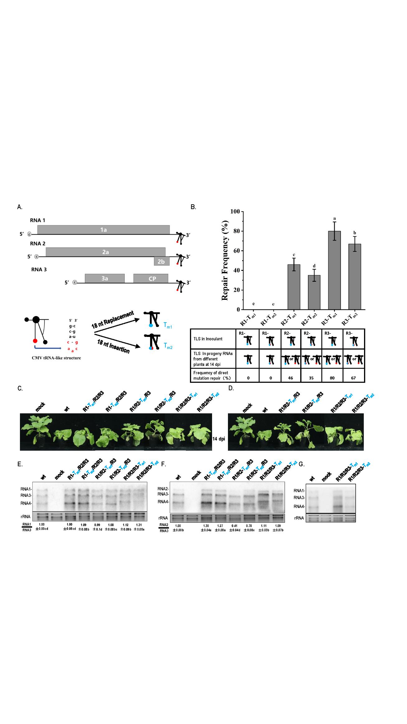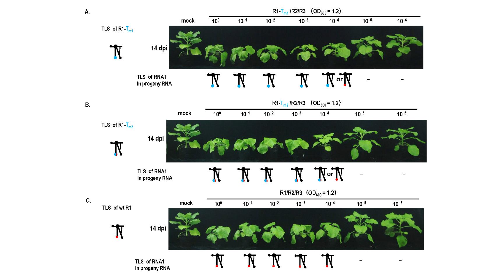 进一步研究表明,高浓度接种时不发生回复突变的RNA1 TLS突变体,若混合2b蛋白(CMV编码的基因沉默抑制因子)突变同时接种,则回复突变率为100%。暗示可能是基因组整体复制量的低水平导致回复突变。随后的RNA1 TLS突变体的梯度稀释接种实验表明,稀释至野生型CMV病毒的稀释限点(OD600=1.2X10-4)时,回复突变发生。说明,回复突变的第二层次是初始接种浓度的高低,接近野生型稀释限点的接种浓度容易触发回复突变。
