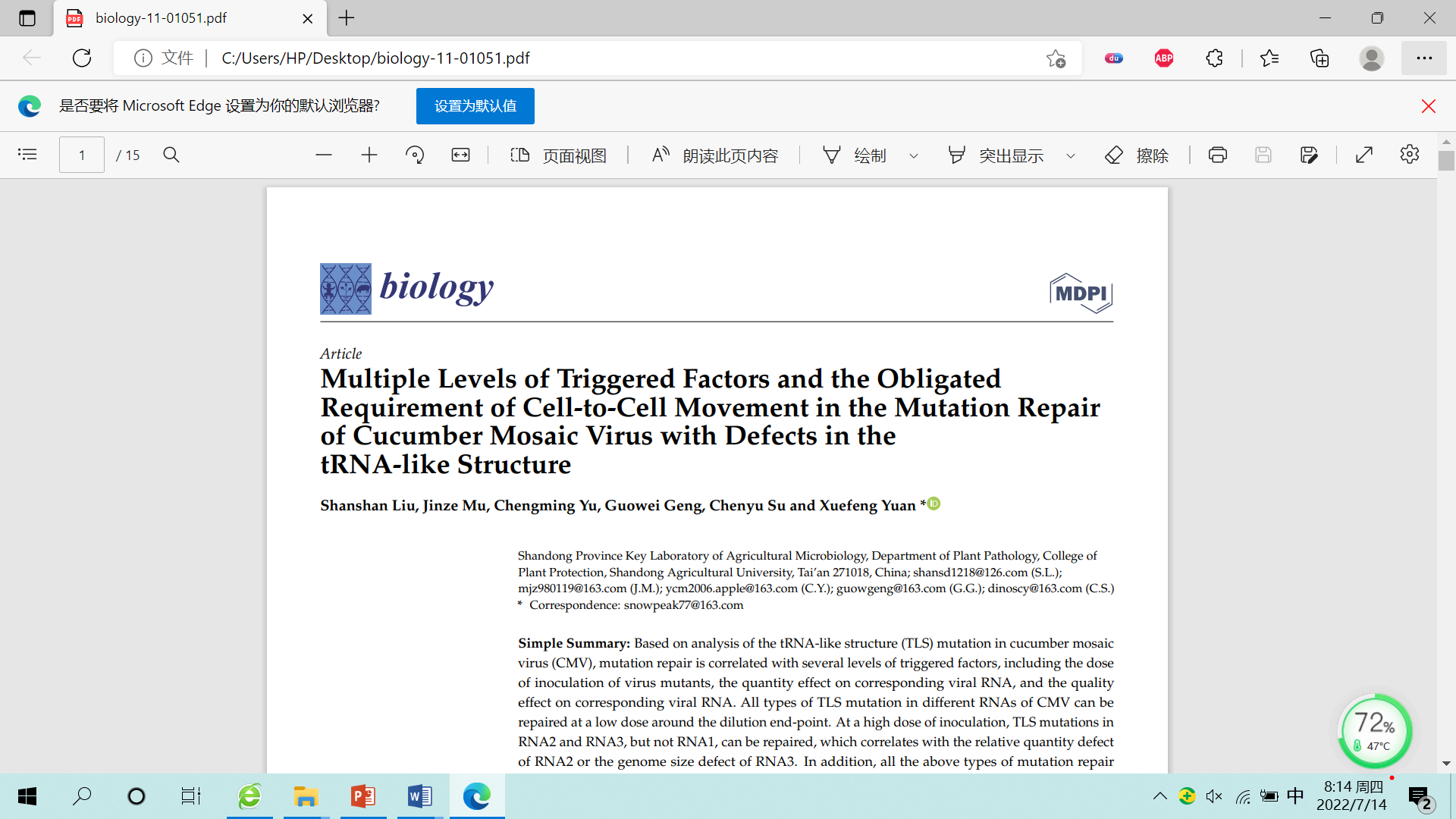 2022年7月13日,植物保护学院原雪峰教授领衔的分子植物病毒学研究团队,在国际生物学期刊《Biology》在线发表了题为“Multiple levels of triggered factors and the obligated requirement of cell-to-cell movement in the mutation repair of cucumber mosaic virus with defects in the tRNA-like structure”论文。该研究为植物RNA病毒分子进化和弱毒疫苗实际应用提供了重要参考,具有重要理论价值和应用借鉴。