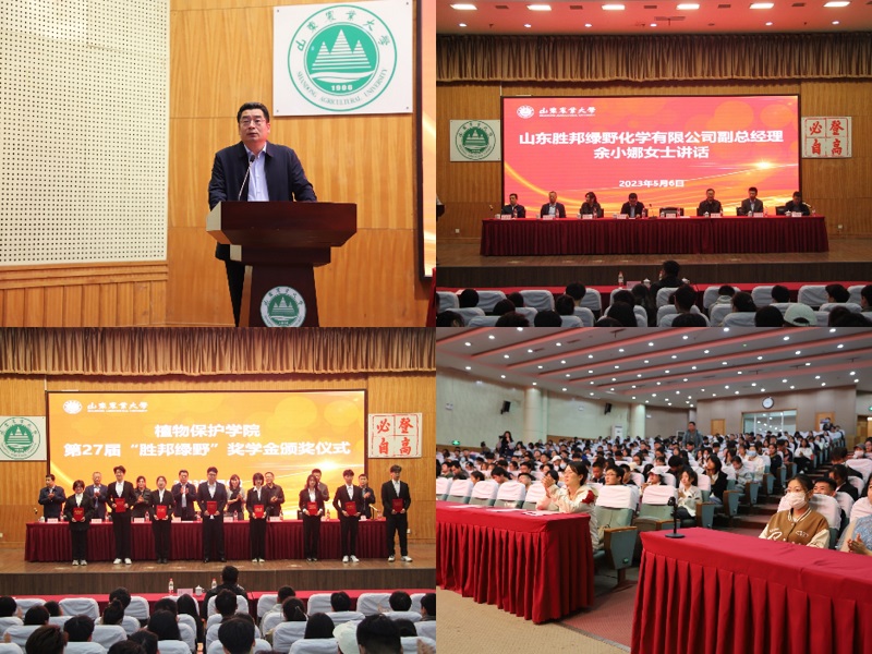 5月6日上午,植保学院于泮河校区第一学术报告厅举办“胜邦绿野”奖学金颁奖仪式。山东农业大学副校长高立明、山东胜邦绿野化学有限公司副总经理余小娜参加活动并为获奖学生颁奖。
