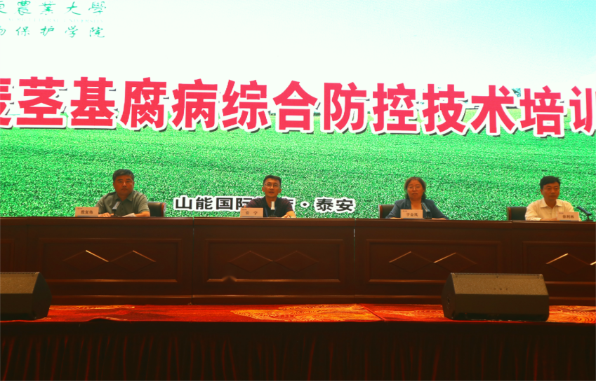 在全国上下深入学习贯彻党的二十大精神、学习贯彻习近平新时代中国特色社会主义思想主题教育之际,山东农业大学植物保护学院以服务“三农”为己任、推进主题教育走深走实,用实际行动深入贯彻习近平总书记“三农”思想,。524日,植保学院联合泰安市农业农村局、岳洋农业合作社举办小麦茎基腐病防控技术现场观摩及培训会。山东省农技推广中心、山东省农科院、山东农业大学、泰安市各县市区农技推广中心、植保站及各县市种粮大户120余人参加会议。