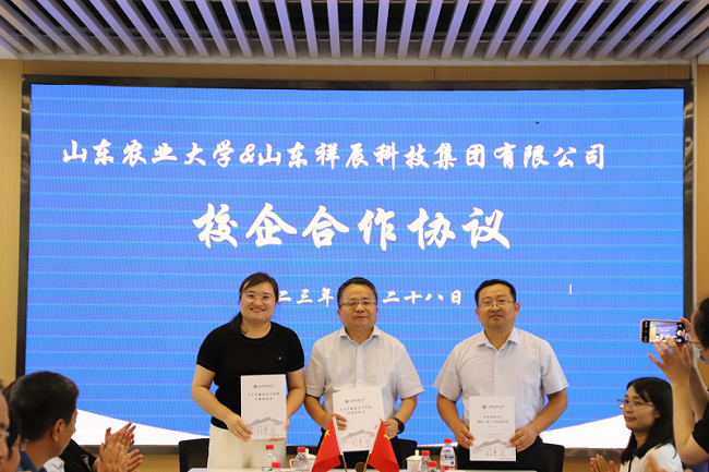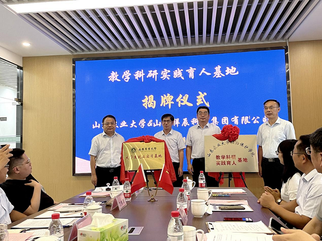 仪式上,高立明、刘振伟、胡宪亮等共同为“大学生就业实习基地”和“植物保护学院教学科研实践育人基地”揭牌。山东农业大学与山东祥辰科技集团有限公司双方代表签订了校企合作协议。