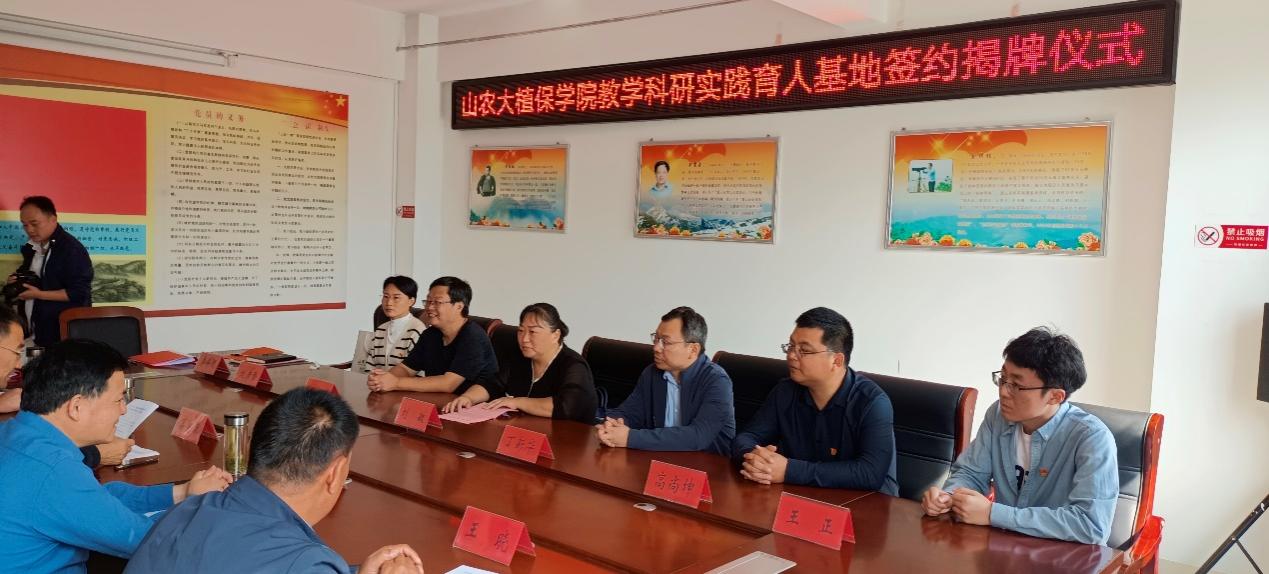 仪式上,山东农业大学植保学院与新泰市国有土门林场签订了山东农业大学植保学院教学科研实践育人基地协议书,山东农业大学植保院副院长丁新华和国有土门林场场长王晓为山东农业大学植保学院教学科研实践育人基地揭牌。