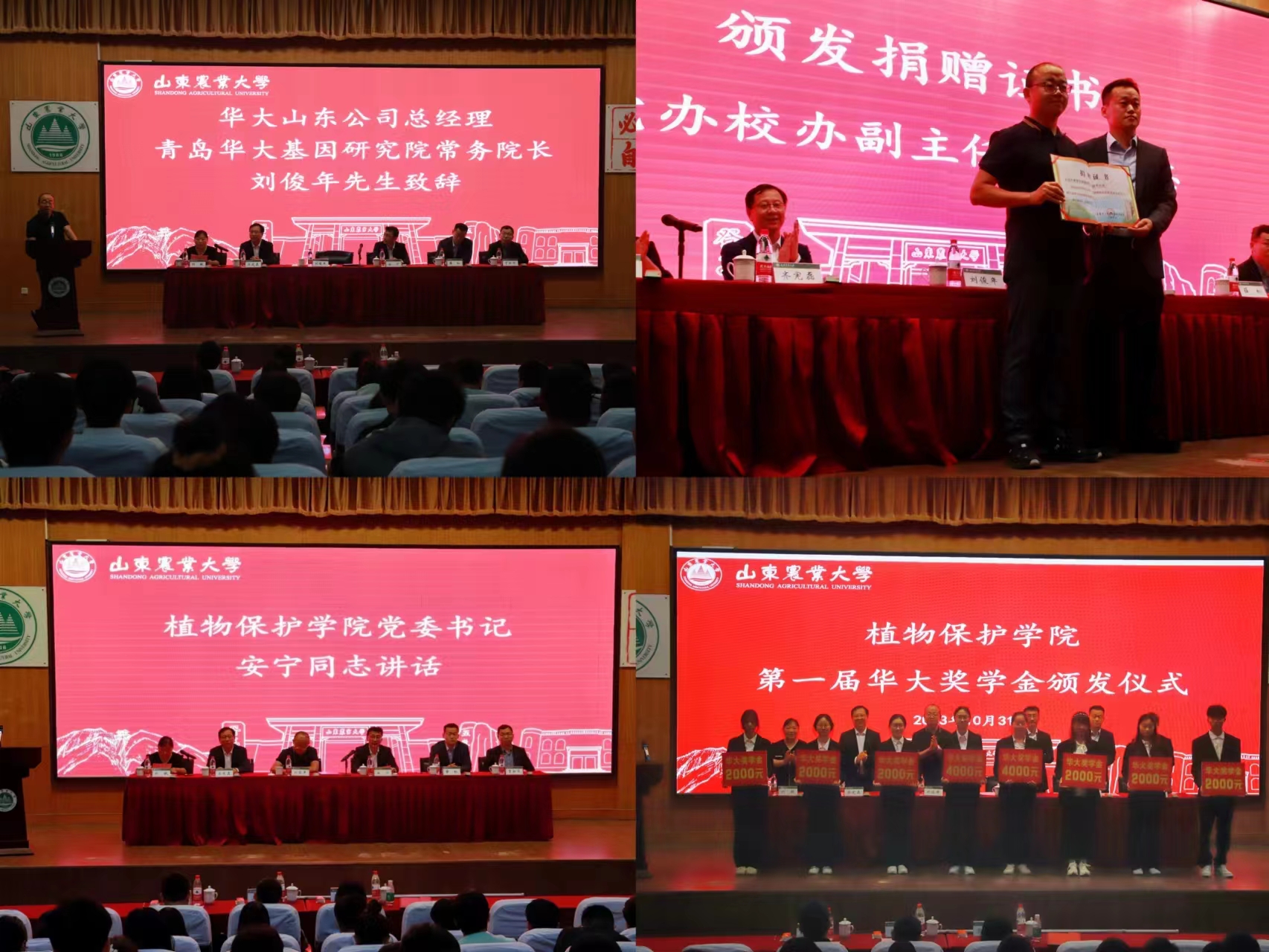 10月31日,植保学院在泮河校区学术报告厅举行第一届“华大”奖学金颁奖仪式,华大山东公司总经理、青岛华大基因研究院常务院长刘俊年,植保学院党委书记安宁,学工委书记齐宪磊,党办校办副主任薛松出席仪式,仪式由学院党委副书记刘敏主持。