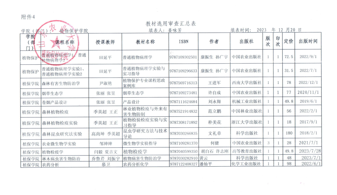为加强教材管理,切实提高教材选用价值导向,根据教育部《普通高等学校教材管理办法》《山东农业大学教材管理办法》等相关要求,学院开展了2023-2024学年第二学期新增选用教材审查工作,现公示如下: