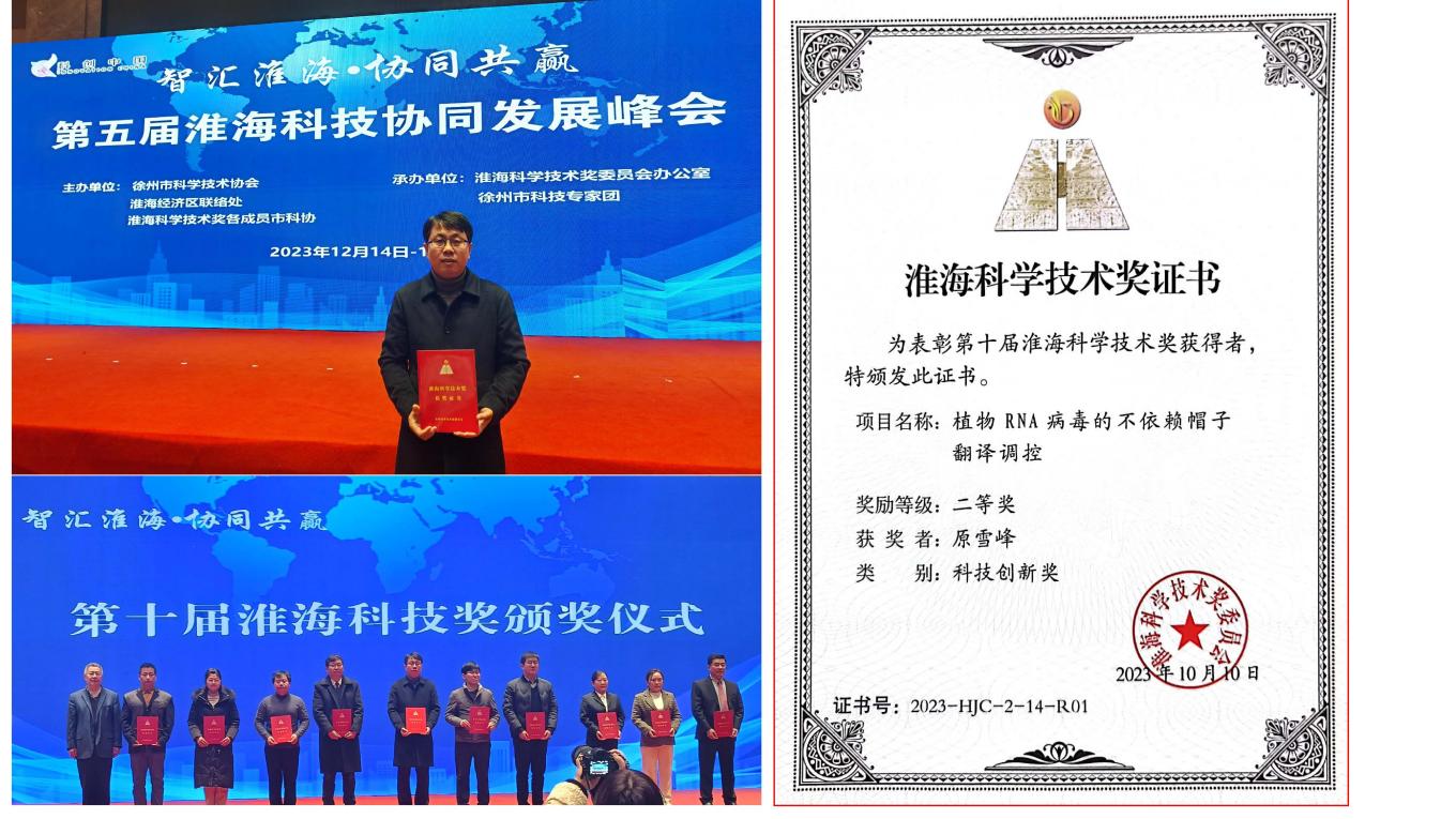 12月15日,淮海科学技术奖委员会举行第十届淮海科学技术奖表彰颁奖,学院原雪峰教授主持成果《植物RNA病毒的不依赖帽子翻译调控》获得第十届淮海科学技术奖二等奖(科技创新奖),作为获奖代表上台领奖。学院教师于成明、刘志菲作为团队成员获奖。