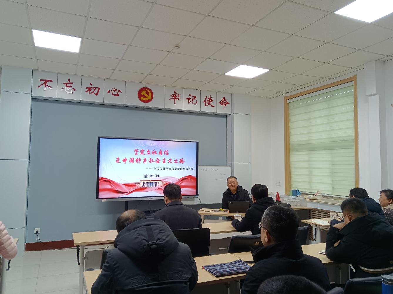 会议伊始,董新胜强调了习近平文化思想在新时代建设中的重要意义,它标志着我们党对中国特色社会主义文化建设规律的认识达到了新高度,表明我们党的历史自信、文化自信达到了新高度,在全社会获得广泛、高度的认可;随后,董新胜针对习近平总书记在新时代文化建设三个方面的阐述进行了深入浅出的分析讲解,并表示习近平文化思想是中国文化凝结出的中国智慧,是马克思主义与中国文化相结合产生的结晶,由此产生的治国理念是中国文化、中华文明包容天下的胸襟、格局和智慧的体现。最后,董新胜号召与会师生细学慢读总书记深邃博大的文化思想,不断坚定文化自信,满怀信心地投入到中国特色社会主义道路建设之中。