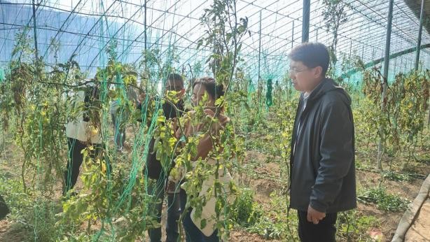 调查过程中,通过与当地种植户沟通交流发现,当地冬小麦返青后存在非正常黄化现象;蔬菜大棚种植的番茄存在严重的腐烂、缩叶等现象。经学会调查人员分析初步认定引发小麦和番茄病害的主要原因是受病毒侵染所致,调查人员对各种病害的发生情况、症状表现、发病规律以及目前采取的防治措施一一进行了详细的记录并从专业角度对农户进行了各类病害的病原及防治要点的科普,同时采集了大量相关样品带回进行更专业的病害鉴定。