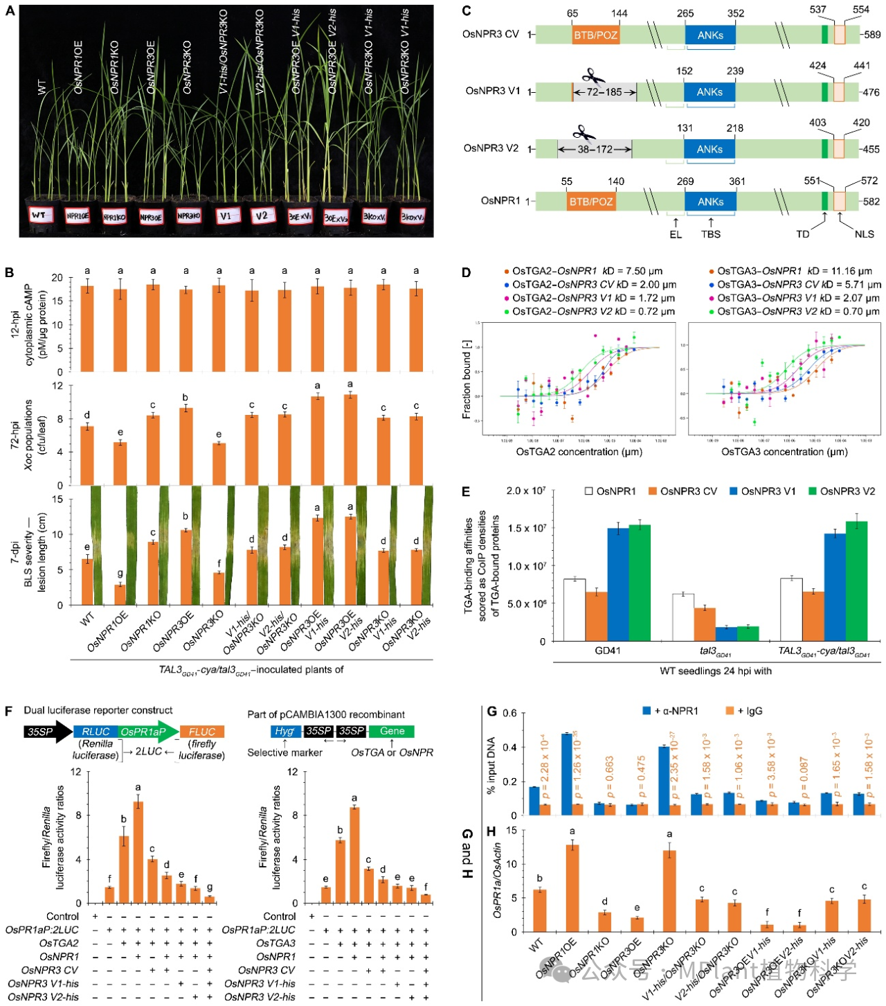 本研究显示,TAL3GD41诱发OsNPR3可变剪接,导致OsNPR3全长转录本(canonical version, CV)和两个短转录本variant 1 (V1)和variant 1 (V2)的产生(图1)。OsNPR3 V1和V2均丢失BTB/POZ结构域,保留了ANK结构域。前人研究指出,BTB/POZ参与NPRs降解,ANK决定NPRs与转录因子TGA结合从而激活防卫反应基因表达。本研究证实,OsNPR3 V1和V2翻译产生的OsNPR3 V1和V2两种蛋白质与OsNPR1竞争结合OsTGA2和OsTGA3,减弱OsNPR1与这两个OsTGA结合的能力,从而抑制OsNPR1作为共转录因子的功能,结果降低了水稻防卫反应基因PR1a的表达水平,削弱了水稻抗病性,赋予病菌致病性(图2)。
