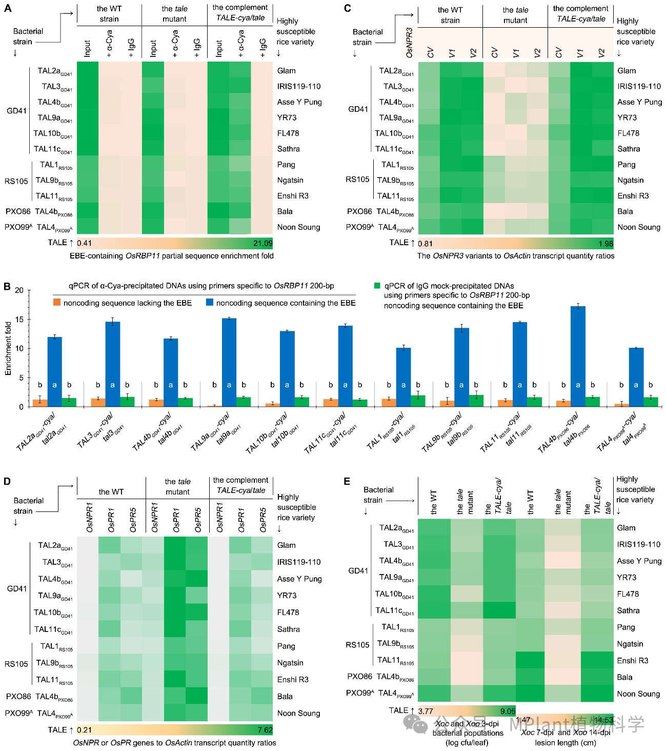 从Xoc菌株GD41和RS105、Xoo菌株PXO86、PXO99A鉴定出80个、克隆了53个TALEs,证明11个TALEs有一个共同靶标,即OsRBP11。对来自世界各地的Aus、indica、japonica和VI/Aromatic水稻共358个品种进行实验,鉴定出这11个TALEs发挥致病性的水稻品种和抗病品种,厘清了一份宝贵的抗病资源,进而证明这11个TALEs在特定感病品种上靶向OsRBP11诱发OsNPR3可变剪接的功能机制(图4)。