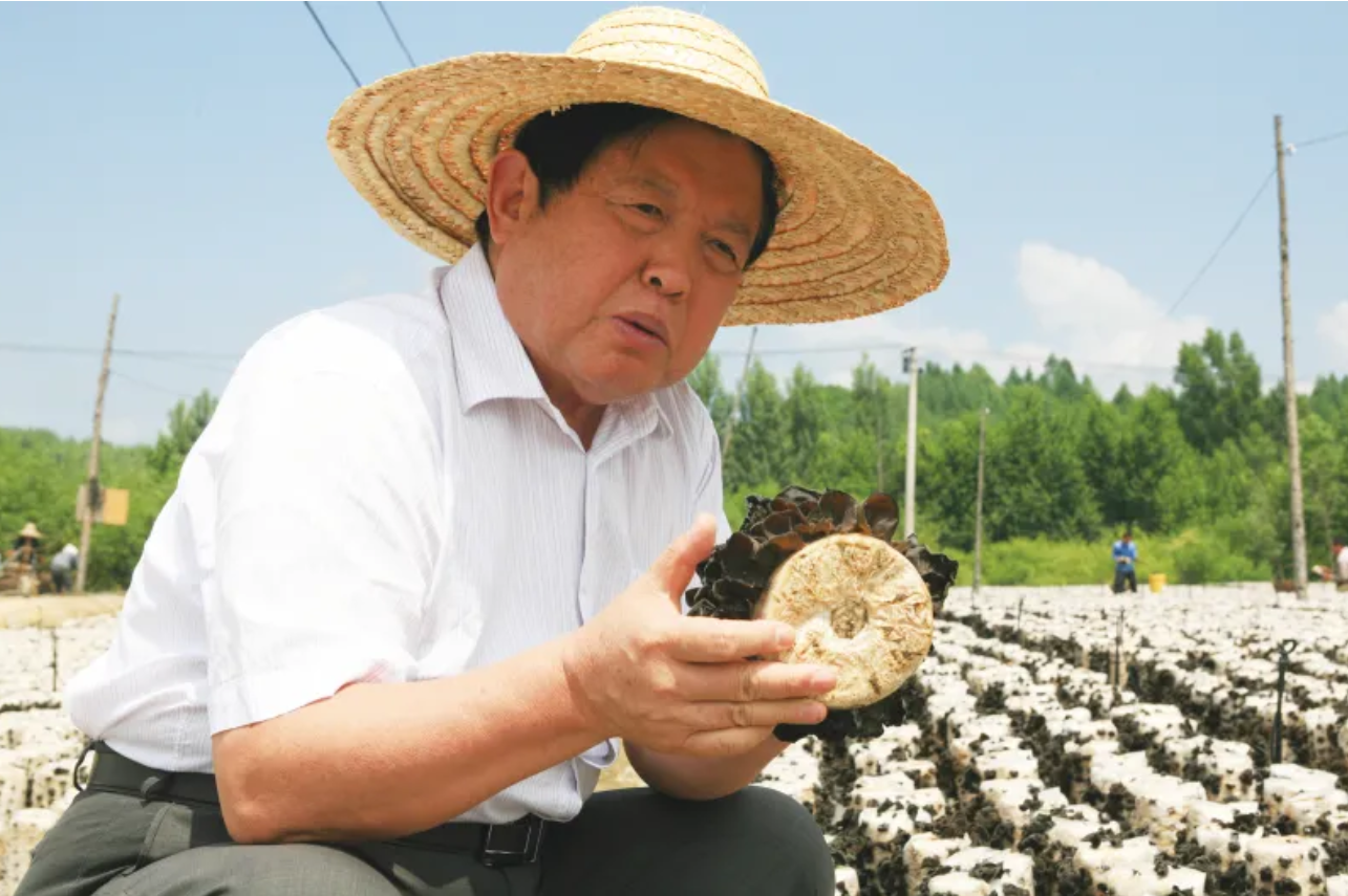 李玉院士在吉林省蛟河市黄松甸镇查看地栽黑木耳生长情况