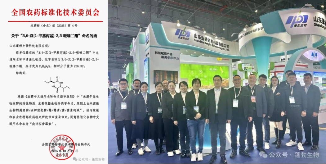 近日,山东植物病理学会会员单位山东蓬勃生物科技有限公司传来重大喜讯:经全国农药标准化技术委员会批准,该公司自主研发的新型微生物源植物生长调节剂——3,6-双(1-甲基丙基)-2,5-哌嗪二酮,正式获得中文通用名称“宛氏拟青霉素”。这一里程碑式的进展,标志着该产品在市场准入道路上迈出关键一步。
