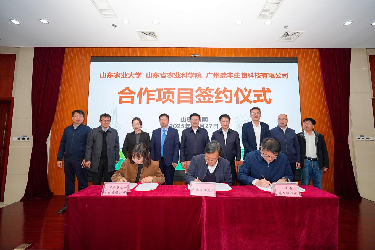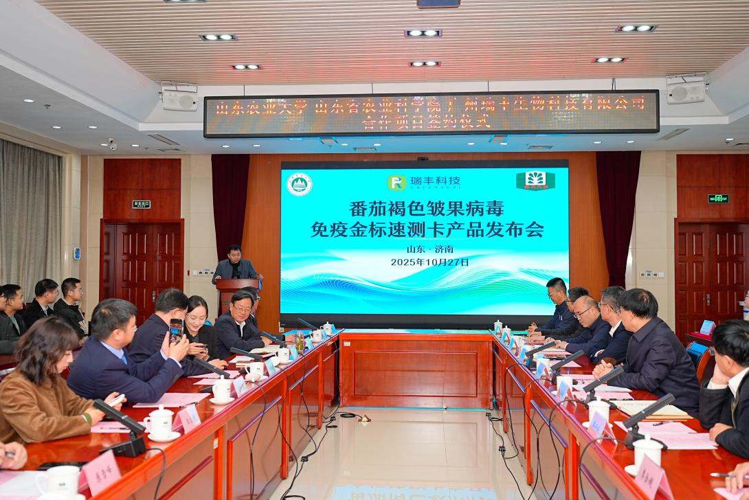 2025年10月27日,山东农业大学植物保护学院植物病毒学李向东团队研发的番茄褐色皱果病毒快速检测免疫金标速测卡在山东济南隆重发布。山东农业大学、山东省农业科学院和广州瑞丰生物科技有限公司签订了三方合作项目签约仪式。全国农业技术推广服务中心有害生物风险分析中心副处长姜培,山东农业大学党委副书记、校长冷畅俭,山东省农业科学院党委副书记、院长李向东,广州瑞丰生物科技有限公司董事长李慎磊以及山东农业大学校社会合作与成果转化处处长王永军、植保学院安宁书记和原雪峰院长以及三方相关负责人和多家媒体记者共同了出席发布会现场,团队成员闫志勇副教授介绍了速测卡的优势和使用方法。