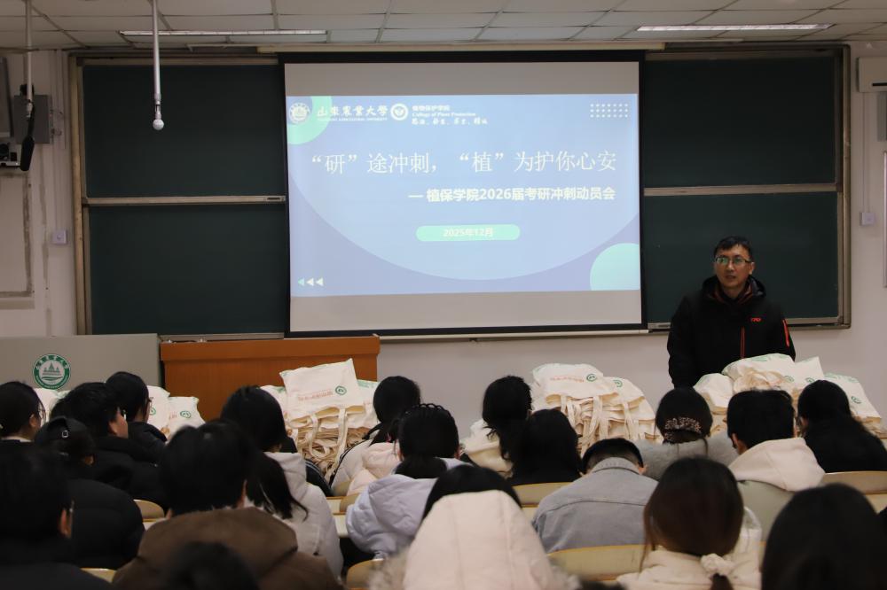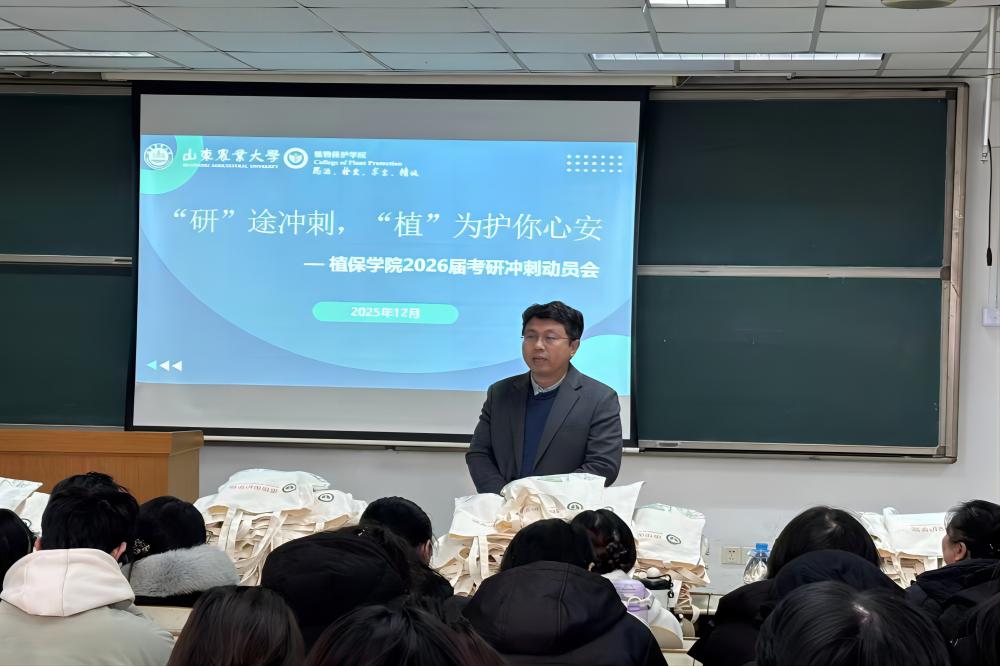 12月9日,植保学院于泮河校区综合楼E308教室开展2026届考研冲刺动员会。学院党委书记安宁、院长原雪峰、副书记刘敏、副院长薛超彬到场慰问考研学子。