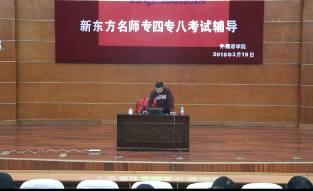 3月19日,外国语学院邀请新东方教育科技集团资深教师王兆飞为学院2015级、2016级英语系及商务英语系学生做英语专业四级、八级考试辅导,辅导会由英语专业主任赵燕主持。