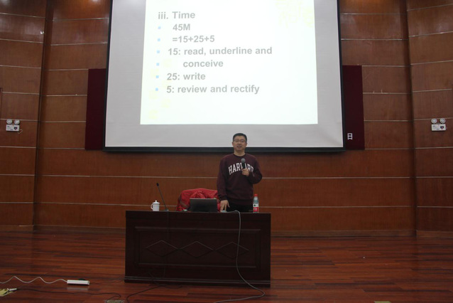 王兆飞首先分析国内个别高校及全国高校专业八级及格率,剖析了2018年3月份英语专业八级笔试试题内容,着重分享了文章写作的两个黄金法:“少出错误、多出彩”——注意书写字体的选择,自己主动找到错误及时纠正,并善于使用亮点模板;“阐明摘要、审题审论据”——运用撰写摘要的技能,对所给材料、选择什么样的论据进行延伸。其深入浅出的写作题型分析使在座学生在短时间内掌握精准独到的万能作文写法,学生受益匪浅。