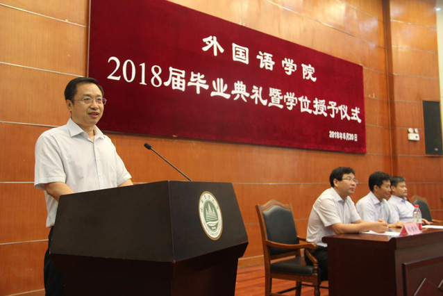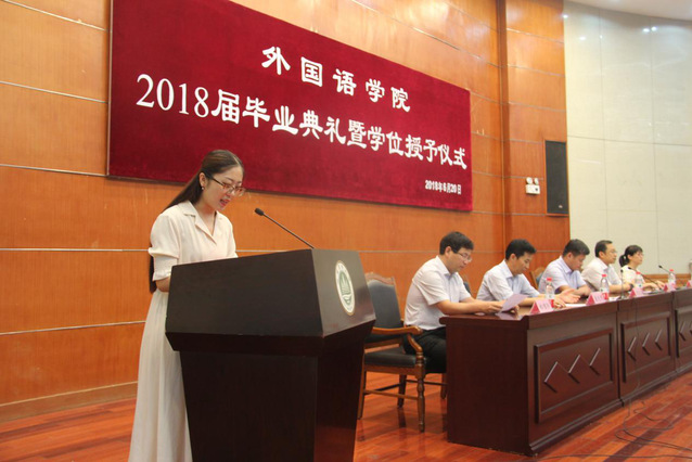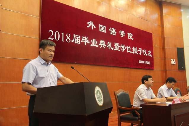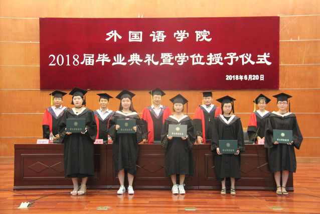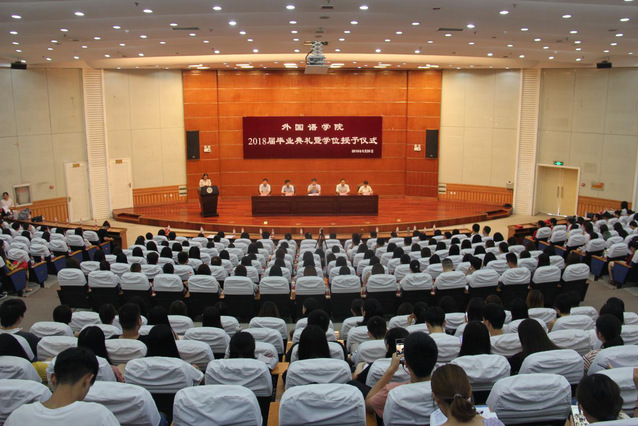 6月20日,外国语学院于文理大楼报告厅举办2018届毕业典礼暨学位授予仪式。学院班子,教授委员会主任,各系室负责人,教师、在校生和家长代表及2018届全体毕业生参加典礼。