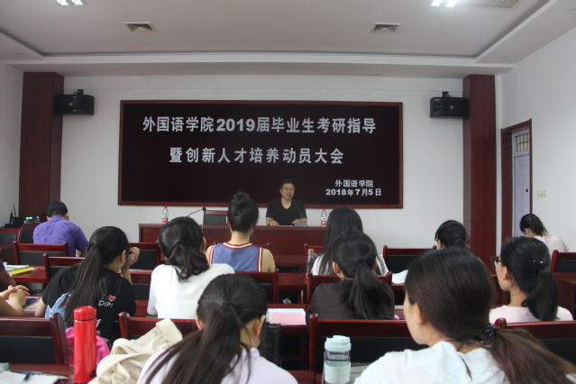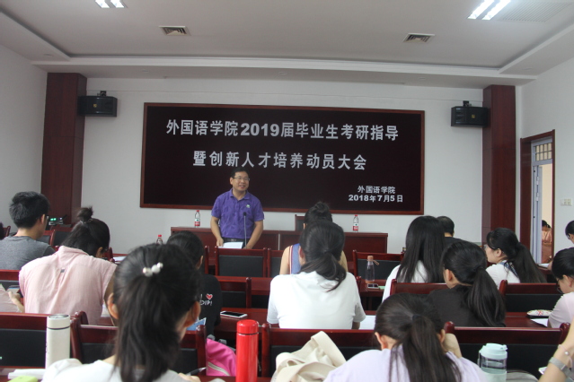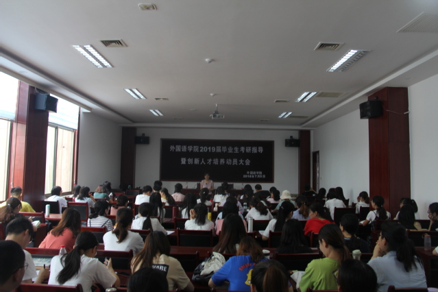 7月5日,外国语学院在文理大楼211举办2019届毕业生考研指导暨创新人才培养动员大会,学院相关领导、辅导员及2015级学生参加指导会。
