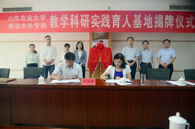 7月9日,山东农业大学教学科研实践育人基地落户泰安市外国专家局。副校长张然出席签约仪式,与市委组织部副部长、泰安市人社局党委书记、局长蒋永斌共同为基地揭牌。