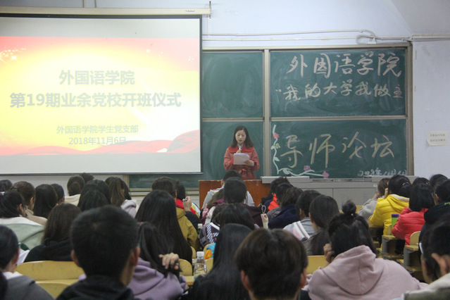11月6日,外国语学院在东校区举办第十九期业余党校开班仪式,学院学生工作负责人、学生党支部书记、辅导员和2018级及部分高年级学生参加仪式。