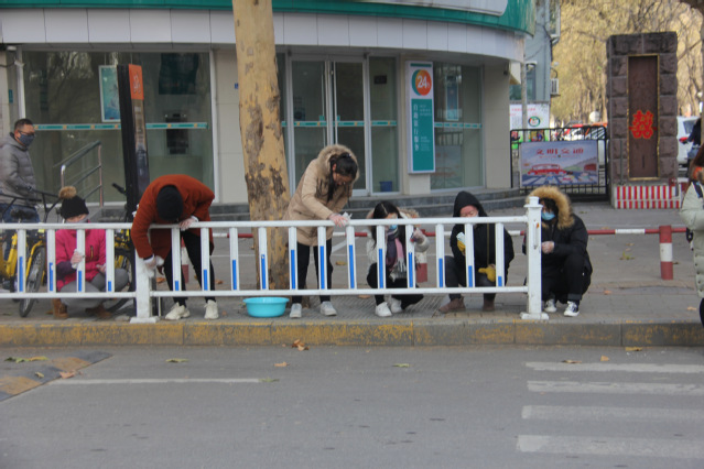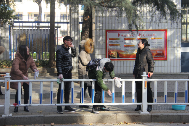 青年学生志愿者一行40余人在团委书记栗晓冬老师的带领下抵达志愿服务地—文化路,在认真了解清理美化工作要求及程序后,大家按照分组,或三五人一群,或七八人一伙,秩序井然地分段打扫清洁路基两侧的护栏。虽有太阳高照,但空气依然清冷,青年学生志愿者们顶着零下七八度的严寒,端水、用抹布清理、再用干布收尾,再一寸一寸移动更换下个地方,动作连贯又熟练,整个过程一气呵成。再有特别手冷的,偶尔双手搓一搓,用嘴巴吹口气热热手,弯下身子再继续。大家经过两个多小时的奋战,顺利完成清理任务,获得了创城工作人员的一致好评。