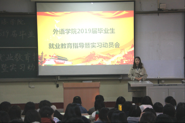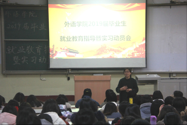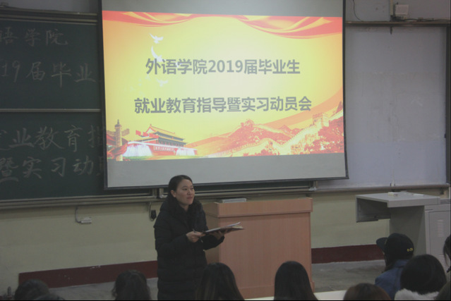12月25日,外国语学院在北校区教学楼举办2019届毕业生就业教育指导暨实习动员会。学院教学和学生工作负责人,辅导员及2015级全体学生参加动员会。