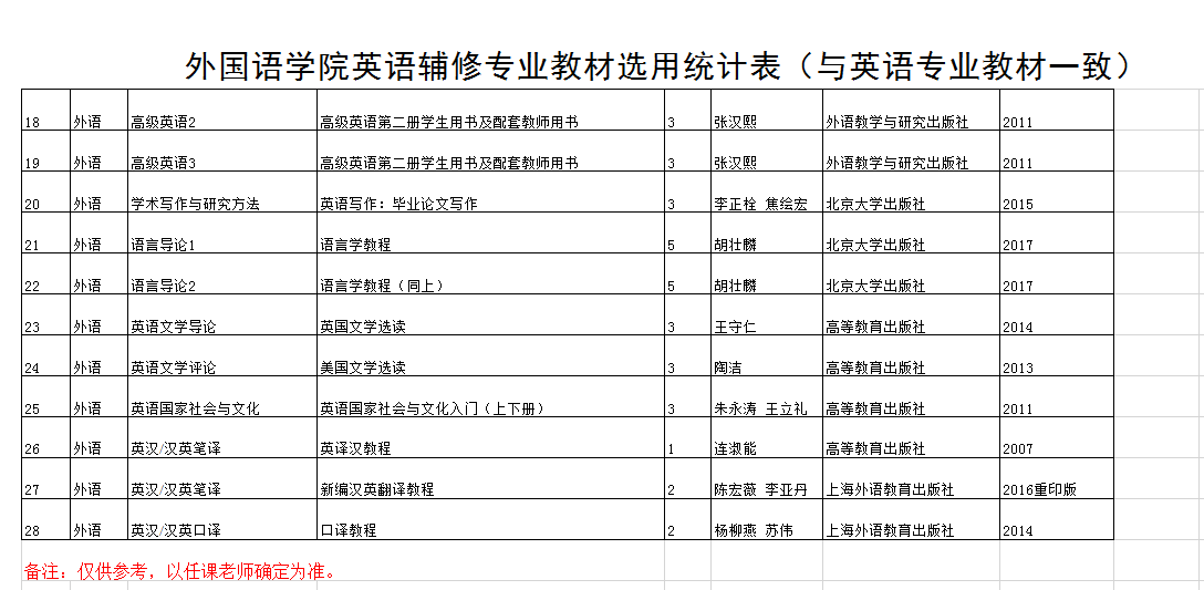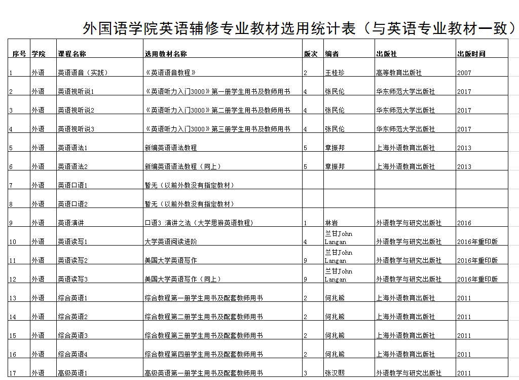 外国语学院英语辅修专业教材选用统计表(与英语专业教材一致)
