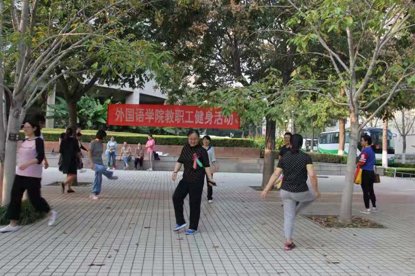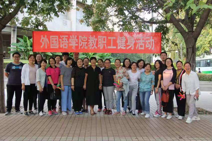9月30日,外语学院于文理大楼前开展教职工庆祝新中国成立70周年健身活动,全体教职工参加活动,学校工会主要负责人莅临现场指导。