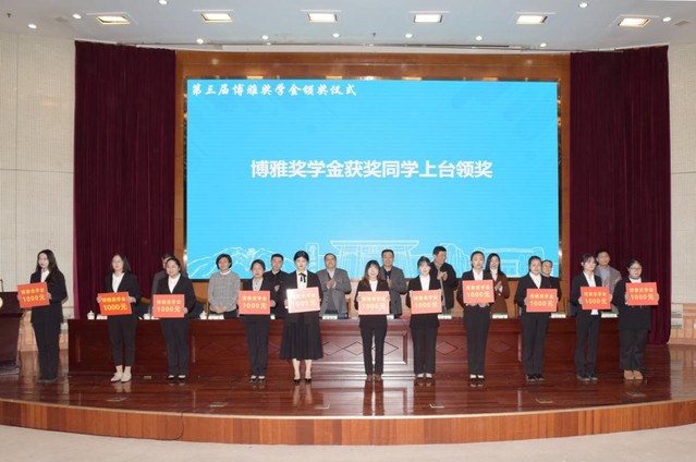 博雅奖学金由我校外国语学院青岛校友会出资创立,旨在激励品学兼优大学生奋发求学、回馈社会。2019年,中品一禾餐饮有限公司和各届校友共同为奖学金注资,为奖学金持续健康发展提供了有力支持。经过严格评审,外语学院朱格纬等11名学生获得本届奖学金。