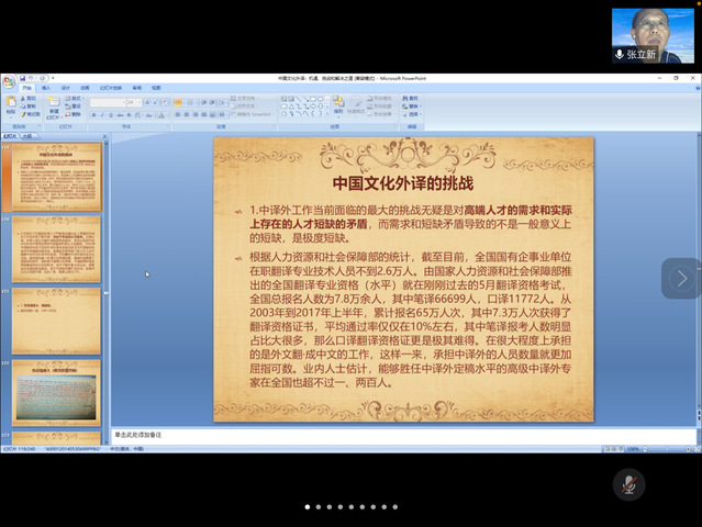 此次报告会中,张立新教授以“中国文化外译:机遇、挑战和解决之道”为题,以点带面,从中国法律文化的角度分享自己从事中国古代法律典籍及相关古籍翻译的经验和见解。他认为,无论是美学、绘画、医药还是法律等领域,根都是中国文化,中国文化始终是翻译的核心。他提到,中国是文明古国,在国家高度重视中国文化对外传播的背景下,中国文化外译任重道远,他呼吁学者用自己的一技之长,潜心钻研典籍翻译,并且在课题选择上应当以个人专业、学校工作岗位、社会发展的热点难点重点为本,帮助优秀中华文化传播出去。最后,针对当前中国文化外译面临的诸如高端人才的需求缺口、古籍翻译难度高、劳动强度大等挑战,他从译文文本、受众需求、传媒媒介三个角度提出六点解决之道。互动环节中,与会教师们纷纷表示受益匪浅,张教授对老师们提出的问题一一耐心解答,与会氛围融洽。