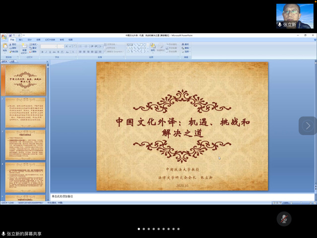 10月16日,外语学院邀请中国政法大学外国语学院张立新教授作线上学术报告,学院全体教师参加报告会。
