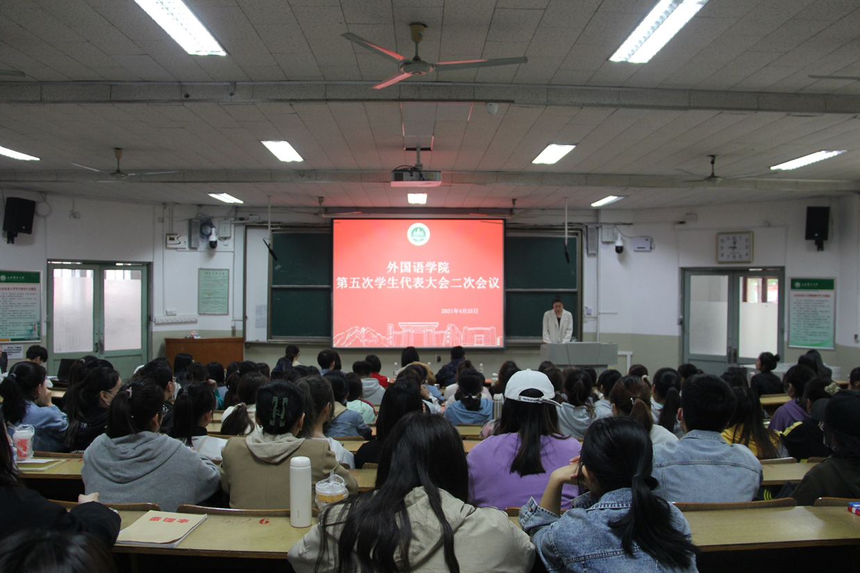4月25日,外语学院在5N102召开第五次学生代表大会第二次会议,进行学生会换届答辩,学院学生工作负责人、全体团干部、学生干部及部分学生代表参加。