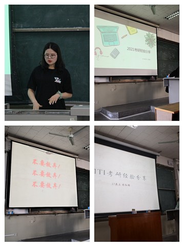 会上,7位优秀学子依次分享自己的考研经验。他们根据自身考研经历,现身说法,就择校的重要性、各科参考书目和复习规划、考研心态以及他们走过的弯路等方面,为2018级学生释疑解惑,化解备研焦虑。姜子乙建议每天固定学习时长,稳住心、静住神,按部就班按计划复习;李文豪给大家分享查阅外文资料的方法;周红锦强调择校、重复记忆和积极暗示鼓励自己的心态的重要性;杨笑影从打好基础,劳逸结合,提高效率方面给大家指导;张琳说考研是场持久战,为大家介绍如何做计划、如何宣泄备研压力;谢亚宁介绍考研形势政策,建议根据所选择学校有针对性有侧重地备考;唐琳则提醒大家在备研遇到困难时要及时寻求老师帮助和家人好友支持。