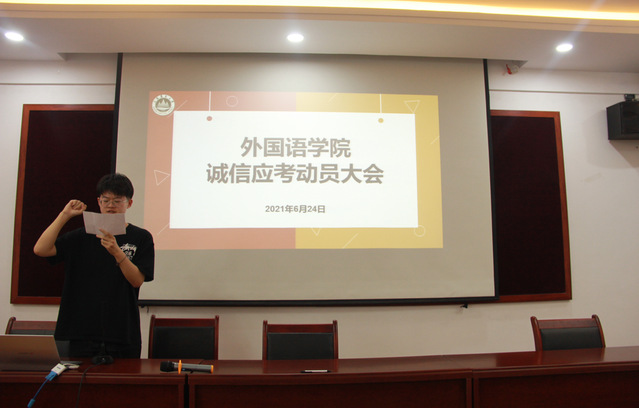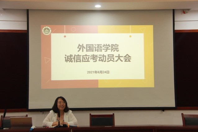 6月24日,外语学院在文理大楼211召开诚信应考动员大会,全体辅导员和学院主要学生干部参加会议。