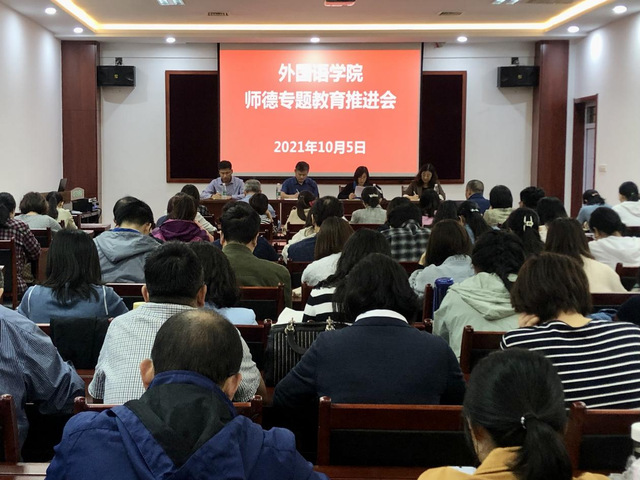 10月5日,外语学院在文理大楼211召开师德专题教育推进会,学院班子成员、全体教师参加会议。