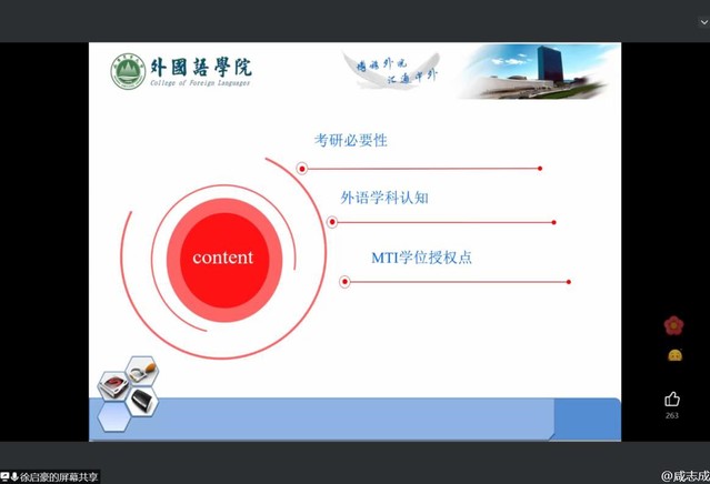 4月3日,外语学院举办2023年线上考研答疑指导会,邀请学院院长翟红华、副院长徐启豪给学生做考研指导报告,学院学生工作负责人、辅导员和2019级学生参加会议。