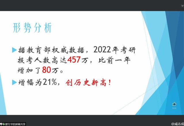 学院院长翟红华就为什么考研、当前考研形势怎样、如何择校、怎么准备进行详细讲解。她以2022年考研报考人数创历史新高为切入点,分析语言类专业特色,指出翻译行业需求逐步增长,社会迫切需求各种翻译人才,就业前景十分广阔。学院副院长徐启豪围绕考研必要性、学科认知和本校MTI学位授权点三个方面展开讲解,对报考本校研究生做动员,为学校争取更多优秀生源。在交流环节中,同学们积极提问,老师耐心详细解答,帮助同学们了解报考专业,朝着目标一步一个脚印认真复习、积极备考。