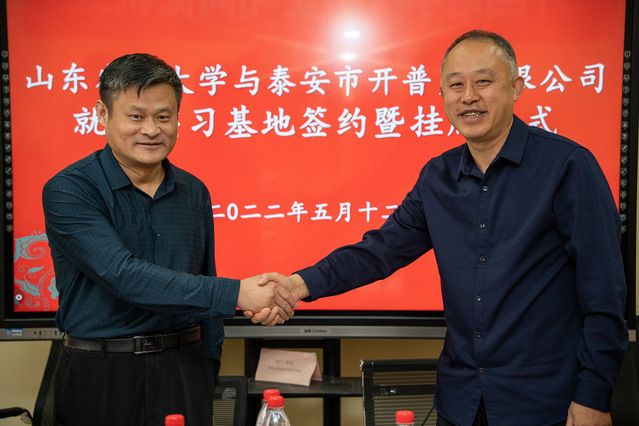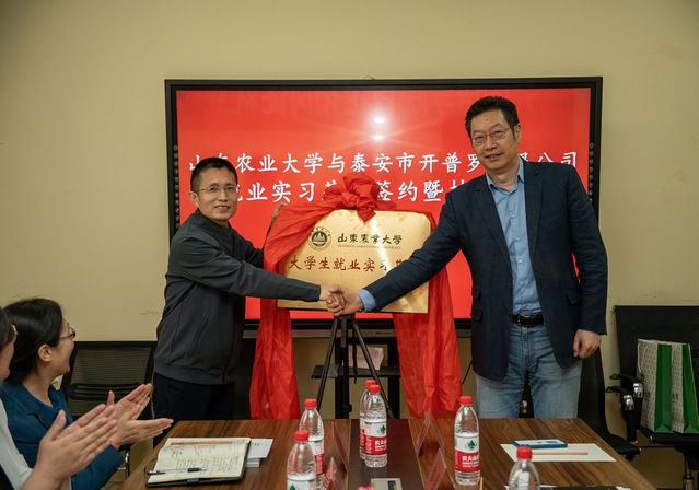 座谈会上,岳远彬强调就业实习基地的建立为校企合作开启了新篇章,希望在毕业生就业、科研等方面进一步深化合作,优质资源共享,持续交流互动,实现校企双促进、共提高。开普罗进出口有限公司董事长王宏感谢学校为企业发展提供的人才资源,希望更多的毕业生选择开普罗、留在开普罗,企业与学校合作更深远、更持久。岳远彬与泰安开普罗进出口有限公司董事长王宏共同为基地揭牌。学工处副处长姜芳介绍学校情况并推介优秀毕业生,外语学院党委书记李茂兵与泰安开普罗进出口有限公司总经理郭剑签订就业实习基地协议。
