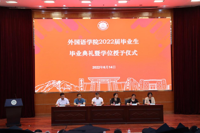 6月14日,外语学院在岱宗校区文理大楼报告厅举办2022届毕业生典礼暨学位授予仪式,欢送359名毕业生。学院班子成员、教授委员会主任、各系教师、2022届全体毕业生及部分在校生代表参加活动。