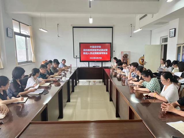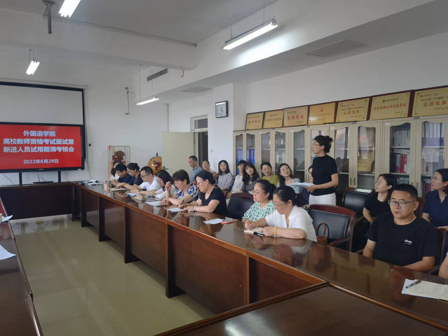 6月29日,外语学院在文理大楼321召开高校教师资格考试面试暨新进人员试用期满考核会,学院班子成员,教授委员会成员,专业主任及相关系室专业教师代表参加会议。